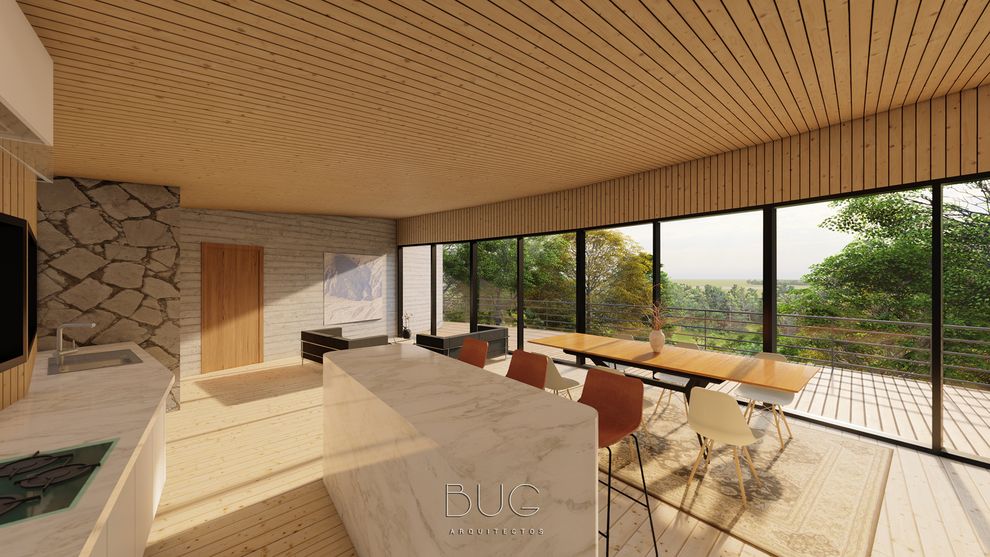 Posee terminaciones de alto estándar, con soluciones pétreas y madera nativa. Casa con independencia eléctrica en base a paneles solares e iluminación LED, con aprovechamiento de la luz solar y con un sistema de captación de aguas lluvias reutilizables. De esta manera minimizamos el impacto al entorno natural, cumpliendo con nuestras visión corporativa.